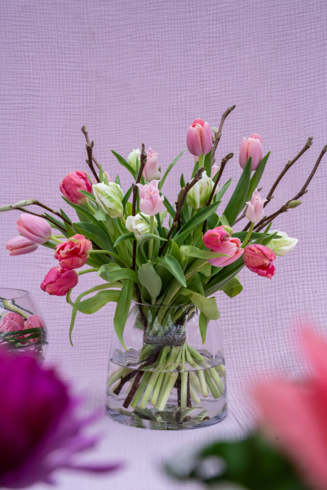 Een bos bloemen gekocht? Zet ze, als je thuis komt, eerst gedurende zeker een half uurtje, met verpakking en al, in een emmer water met snijbloemenvoedsel. Zorg ervoor dat alle stelen goed in het water staan. Snijdt het uiteinde van de stelen schuin bij met een scherp keukenmesje (geen snoeischaar gebruiken want daarmee druk je de vezels plat).